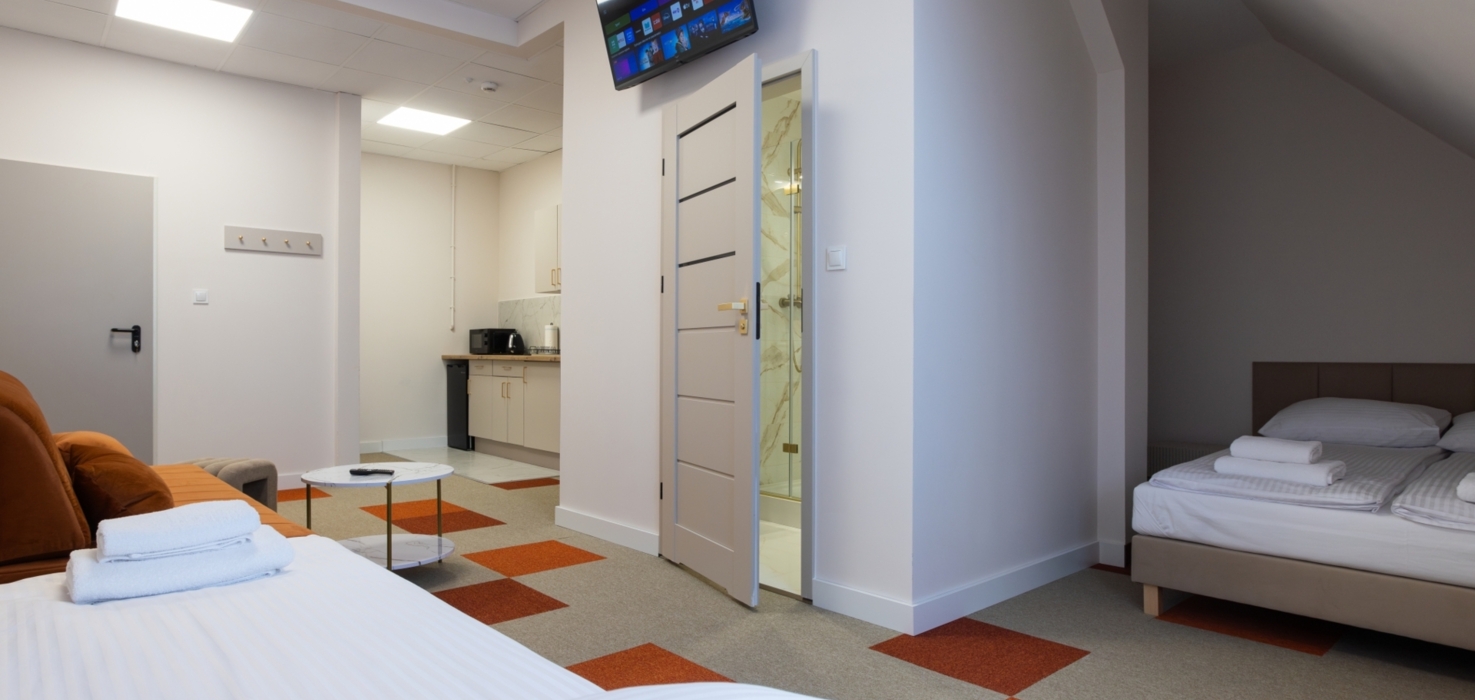Pokój dwuosobowy wyposażony jest w prywatną łazienkę z prysznicem i suszarką do włosów. W pokoju znajduje się jedno duże łóżko typu double. Komfort zapewniają wykładzina dywan...